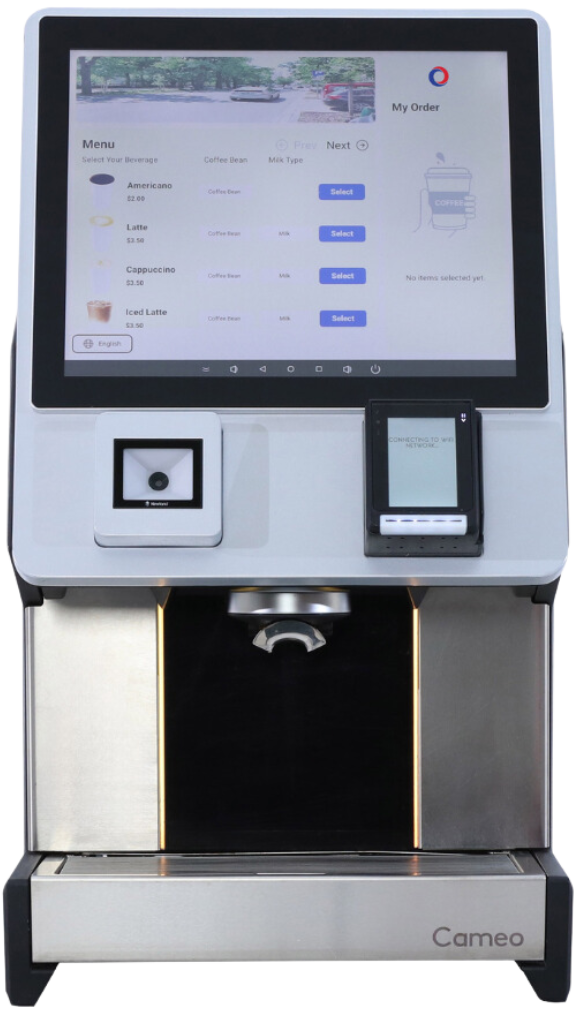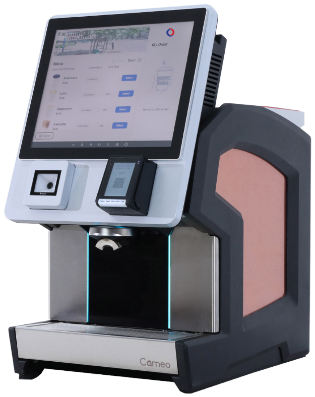 The CameoPay is a future-forward, 24/7 compact coffee solution designed for any location. Featuring a user-friendly touchscreen interface and built-in QR code and payment reader, CameoPay enhances the coffee experience for your customers, delivering ease and efficiency at the touch of a button.