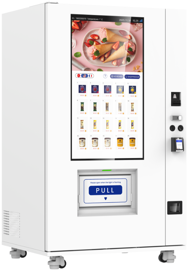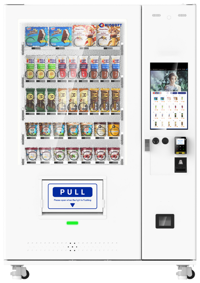 The KioVend TF45E2 Frozen features elevator dispensing technology and a 49” touchscreen display. It is designed to accommodate a wide range of frozen and temperature-controlled items, holding up to 270 items, ensuring ample capacity for diverse offerings.