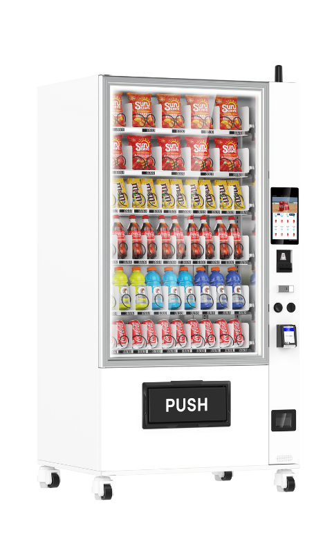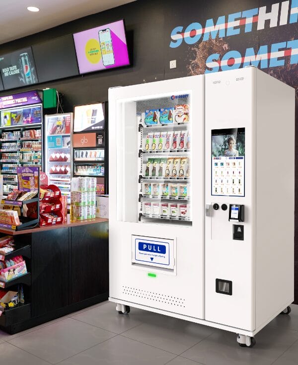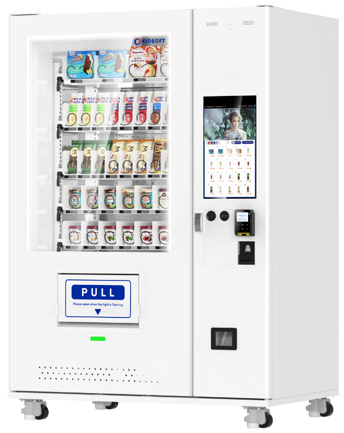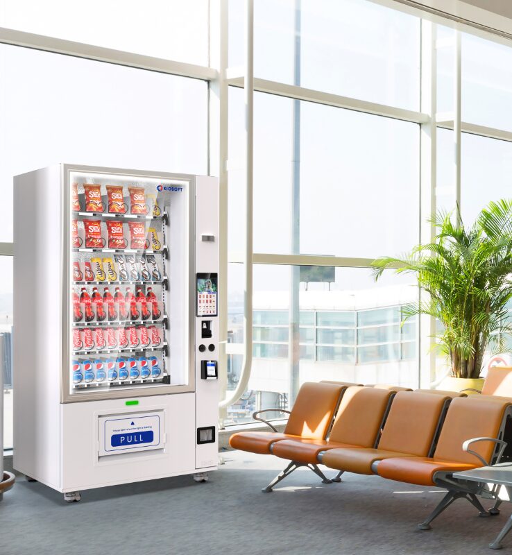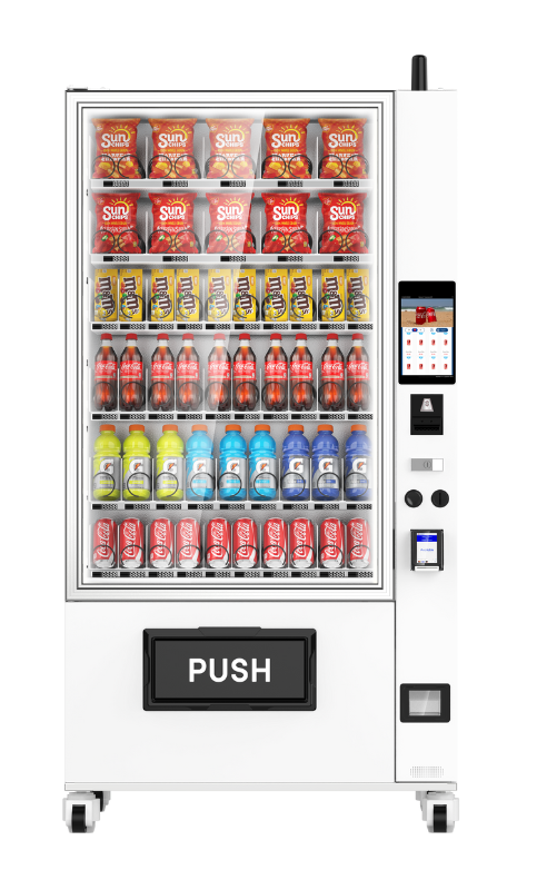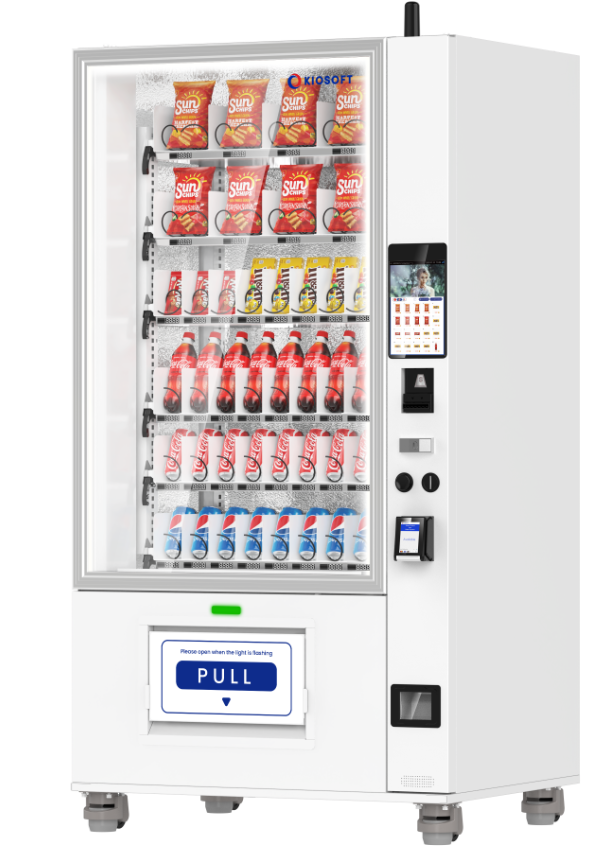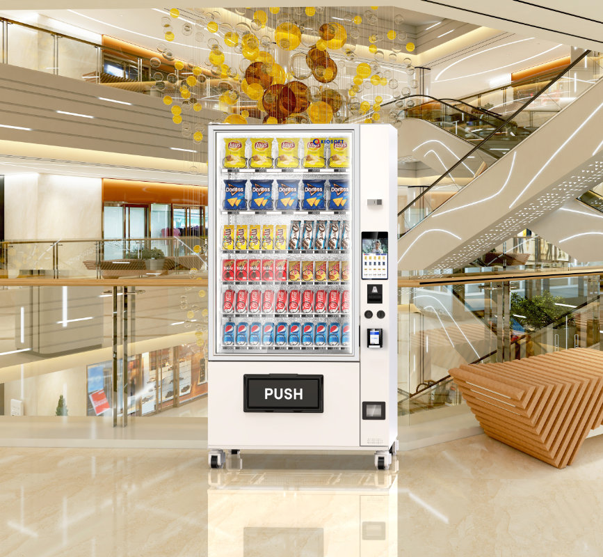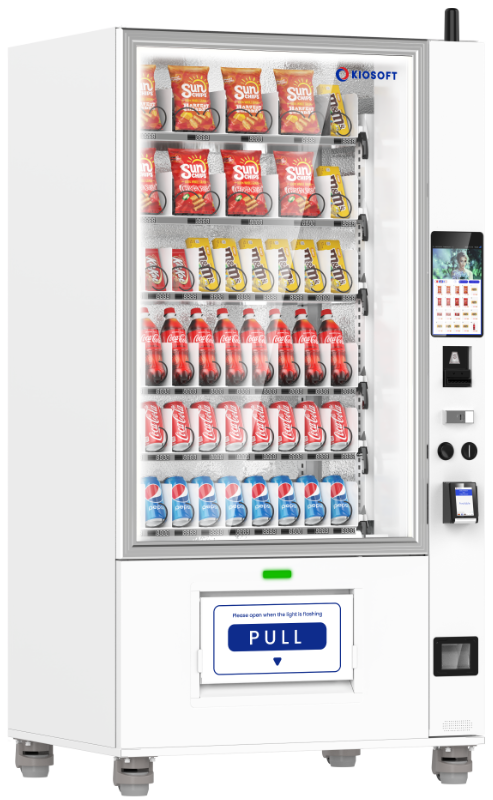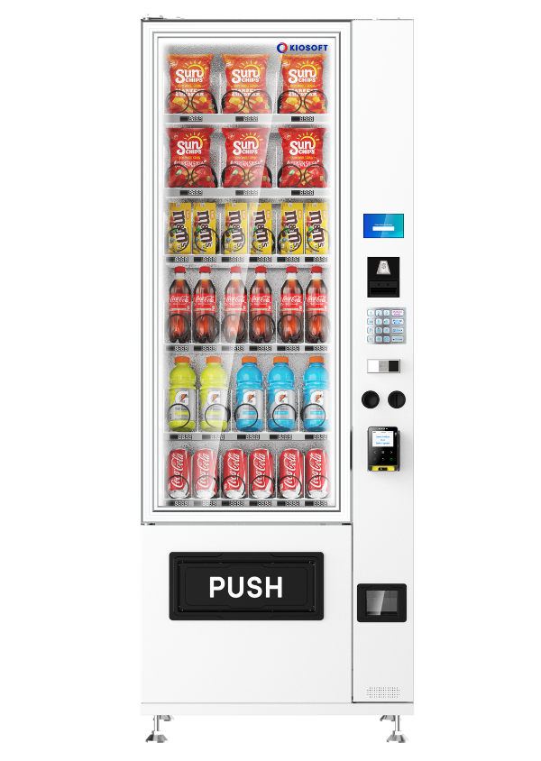 The KioVend TSD70E Max is a high-capacity elevator vending machine designed for diverse product offerings, holding up to 420 items. Its advanced elevator technology ensures smooth dispensing, while an optional sidecar supports bill and coin payments for added convenience.