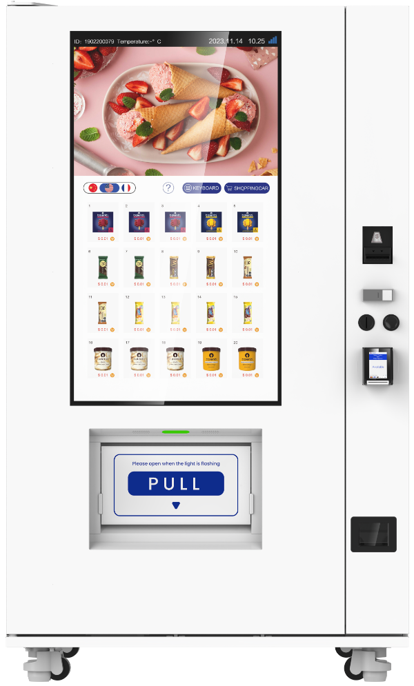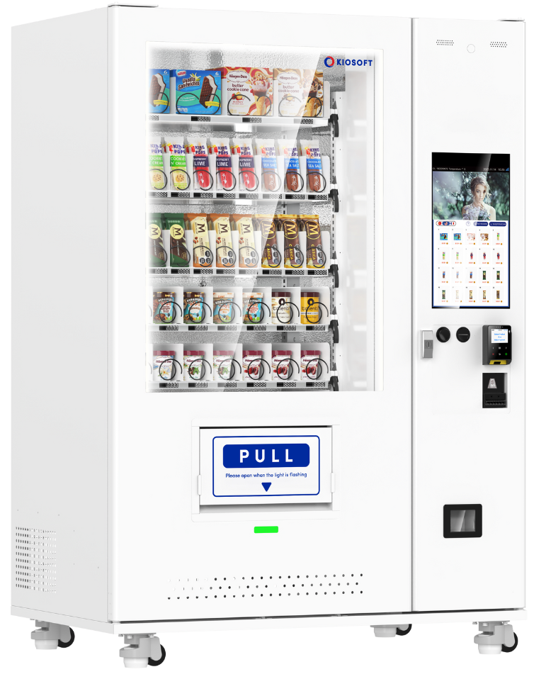 The KioVend TF45E Frozen features elevator dispensing technology and a 21.5" touchscreen. It is designed to accommodate a range of temperature-controlled items, including fragile and frozen goods, making it a secure solution for all your vending needs.